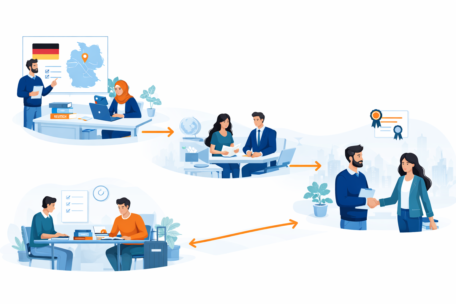 Chez KomDeutsch, nous accompagnons celles et ceux qui veulent construire un avenir en Allemagne.